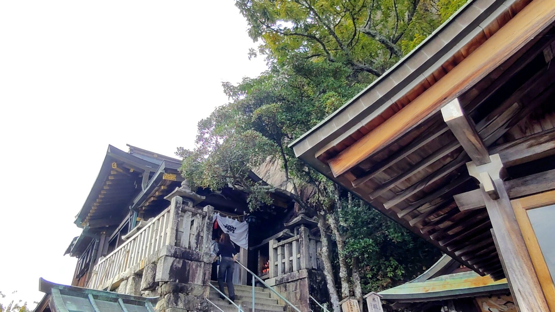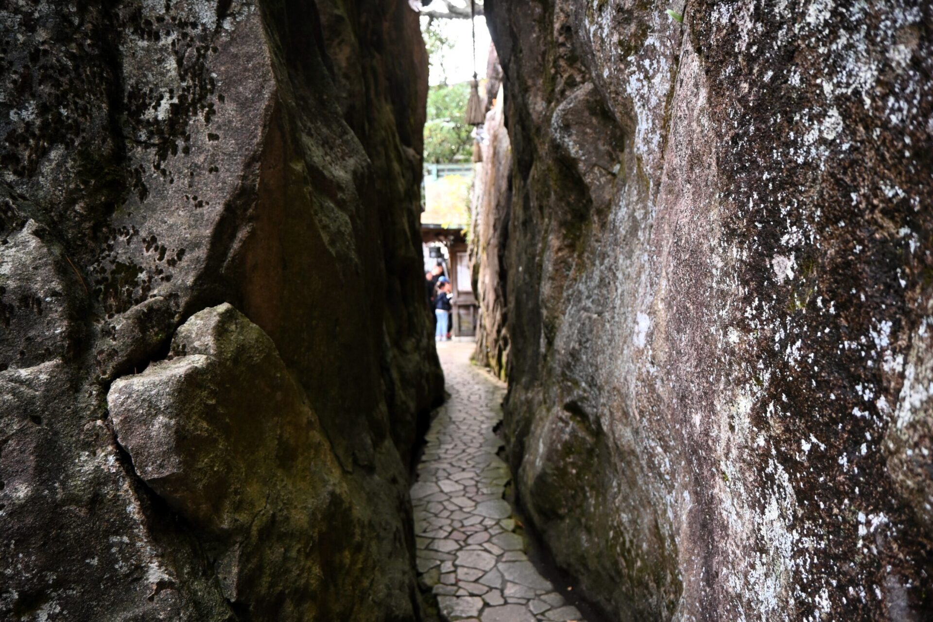 Devant le bâtiment principal s’élève un énorme rocher appelé le « Rocher des Époux » (Meoto-iwa). Le chemin qui passe entre les deux rochers n’est large que de 80 centimètres. On dit que si l’on formule un souhait en le traversant, il se réalisera, mais que les menteurs se feront coincer par les rochers. J’ai donc traversé moi aussi, non sans une certaine appréhension.