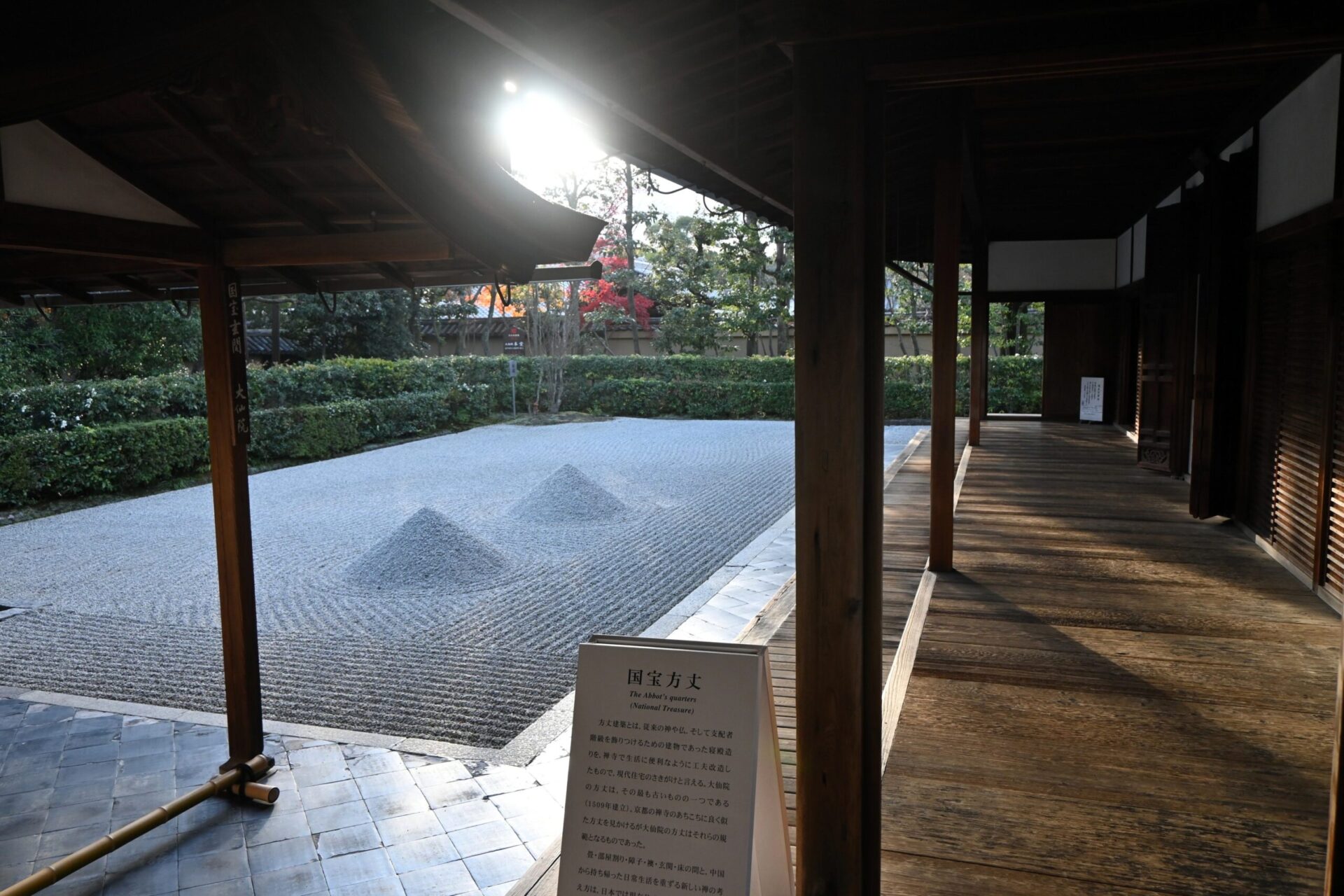 Le jardin du temple zen Ryoan-ji est sans doute le modèle le plus emblématique du style karesansui à Kyoto. Il se compose de quinze pierres disposées sur un lit de gravier blanc ratissé. Il a été conçu pour la méditation, mais certains visiteurs trouvent que son esthétique, poussée à l’extrême du dépouillement, manque d’intérêt. Par ailleurs, il devient de plus en plus difficile de s’y livrer à l’introspection en toute sérénité ces derniers temps en raison de l’afflux de touristes…