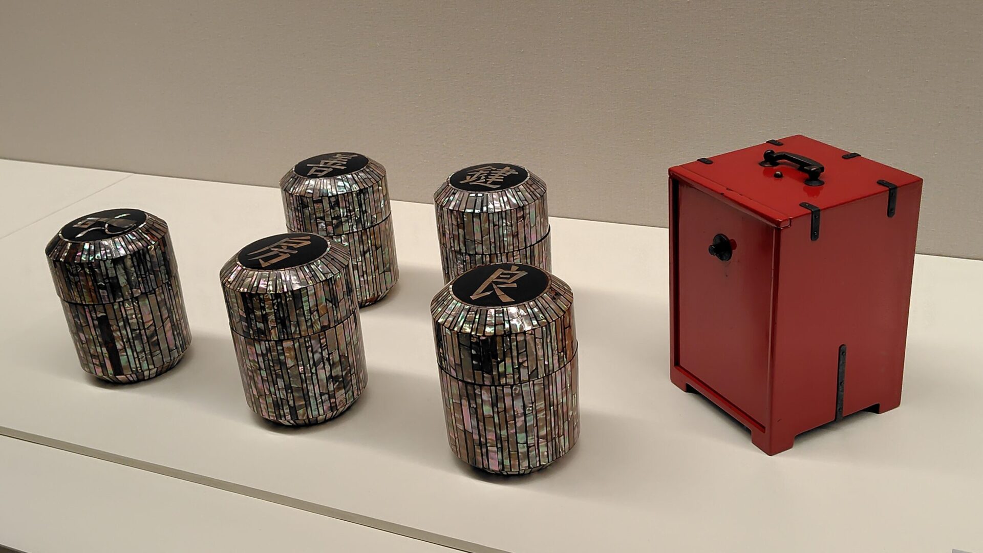 Tatsuaki Kuroda (1904-1982), artisan laqueur et menuisier né à Gion, Kyoto, a également eu des liens étroits avec les débuts du mouvement mingei. Kyoto comptait de nombreux adhérents au mouvement mingei, dont le célèbre confiseur traditionnel de Gion, Kagizen Yoshifusa. Kuroda a conçu le mobilier et les ustensiles de Kagizen Yoshifusa, incarnant ainsi l’union de l’utilité et de la beauté. La photo ci-dessous montre des récipients incrustés de nacre pour le kuzukiri (un dessert à base de fécule de racine de kudzu, servi froid sous forme de nouilles avec de la mélasse noire), commandés par Kagizen Yoshifusa à Kuroda. Bien que sa décoration en nacre soit magnifique, il possédait également la praticité nécessaire pour servir ce dessert délicat aux clients tout en le maintenant au frais.