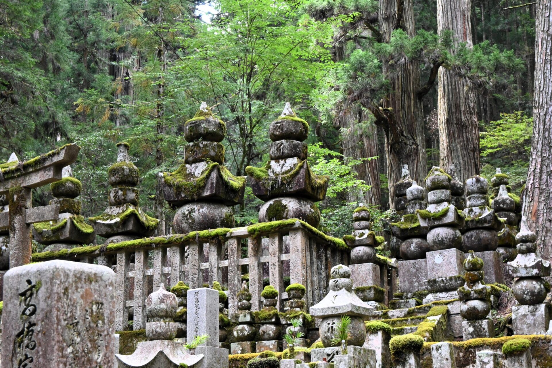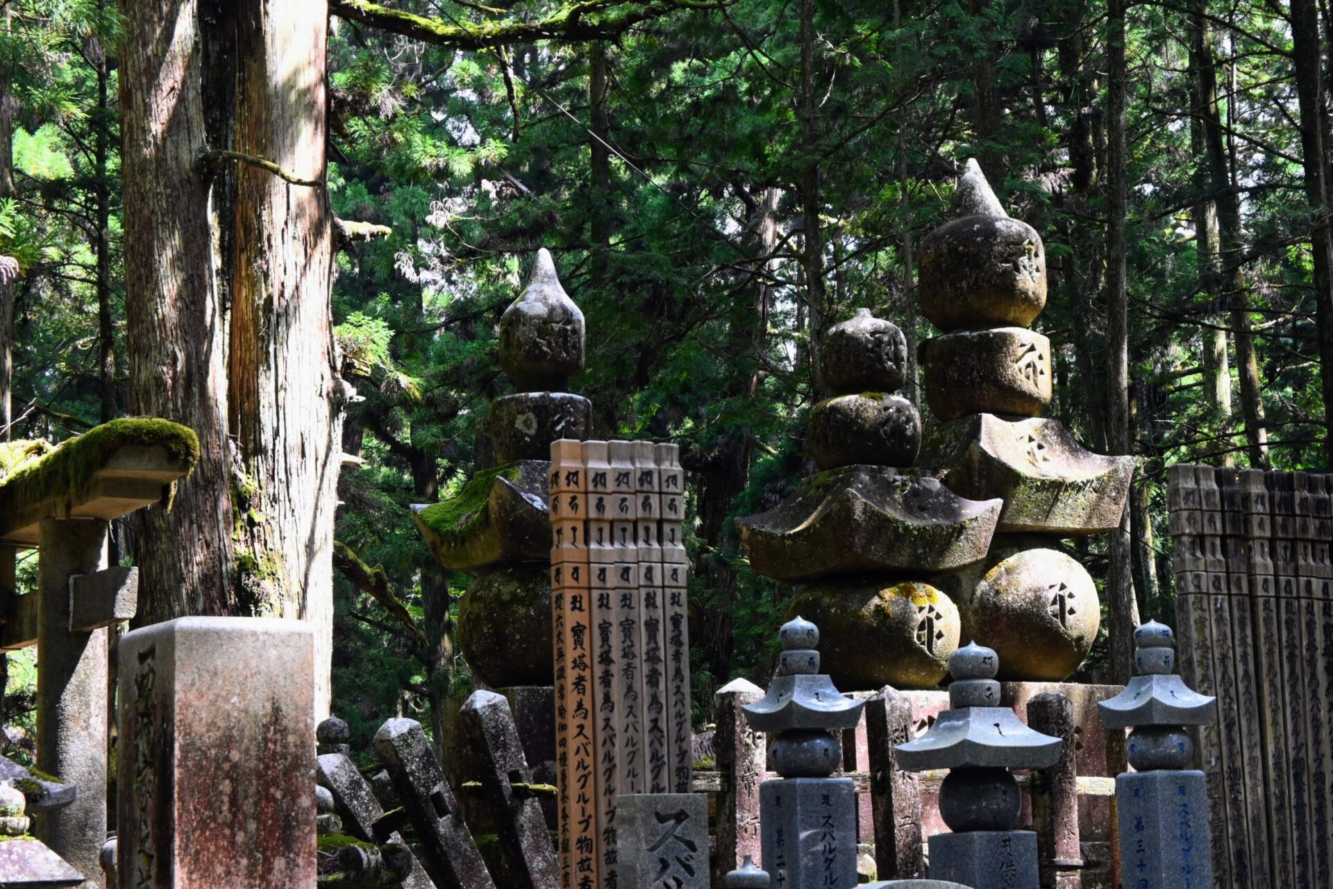 Le cœur de la visite du mont Koya réside dans la découverte de l’Okuno-in, qui occupe une vaste partie de l’est du plateau. Cette nécropole s’étend sur deux kilomètres, du pont Ichi-no-hashi jusqu’au mausolée de Kukai. Plus de 200 000 pierres tombales et pagodes de toutes époques s’y alignent au milieu de cèdres millénaires. Entre le bruissement du vent dans les cimes, la lumière filtrant à travers les branches et les stèles couvertes de mousse… l’ambiance sereine et mystique qui y règne vous saisira à coup sûr.